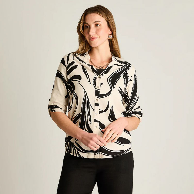 Esta blusa mezcla lino/viscosa manga codo con roll-up y mas larga en la parte trasera suma un aire natural y elegante. El estampado botanico en negro realza el tono arena y su calce normal ofrece comodidad para dias calidos, desde looks casuales hasta mas arreglados.
