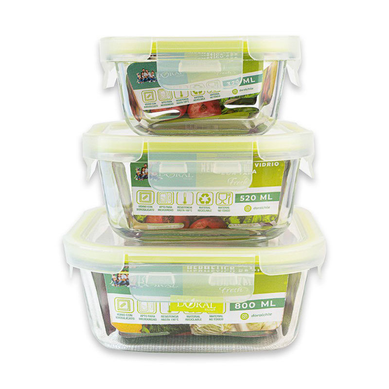 Contenedores hermeticos cuadrados de vidrio borosilicato con tapa Fresh. En formatos de 320, 520 y 800 ml. Apto para microondas(sin tapa) , ideal para conservar y recalentar. Su tapa hermetica asegura un cierre firme que evita derrames y mantiene la frescura por mas tiempo.Precio Normal: $ 5.990* Precio Válido Solo Sitio Web - DORAL