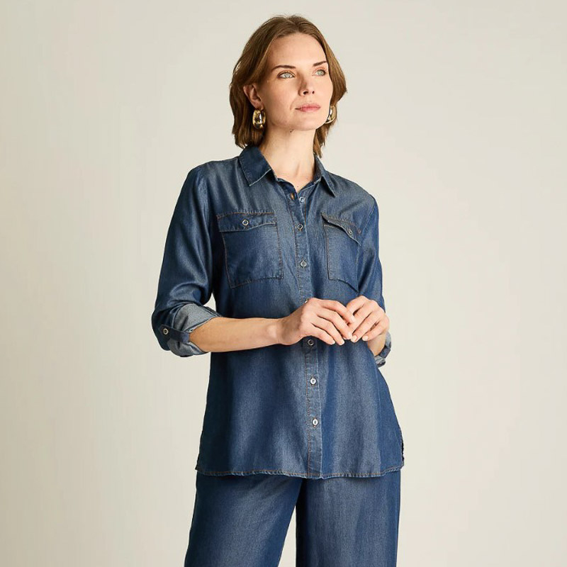 El diseno con cuello camisero y bolsillos con tapeta en el pecho aporta estructura, mientras que la