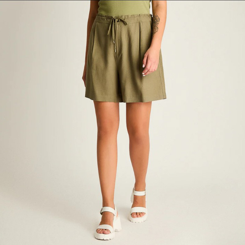 Bermuda en tono azul marino de tejido plano sin elasticidad, calce normal y pretina con amarre